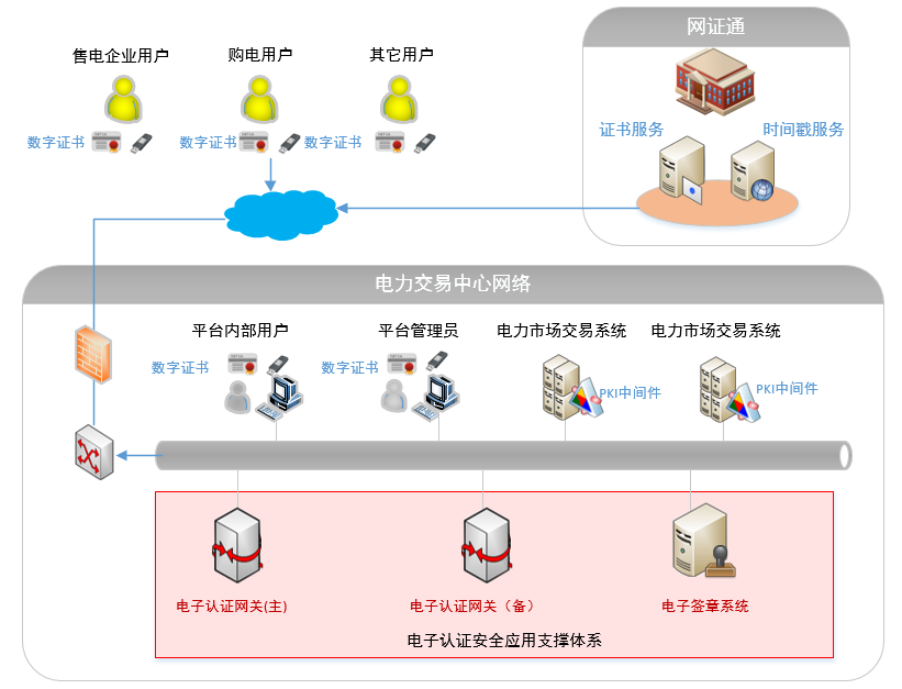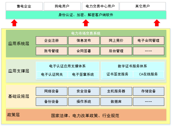 引入合法第三方CA電子認證技術(shù),搭建電子認證支撐平臺,與電力市場交易系統(tǒng)有機結(jié)合,解決電力交易的身份認證安全、數(shù)據(jù)傳輸安全、網(wǎng)上報價保密、網(wǎng)上合同簽署的合法性等安全需求。
